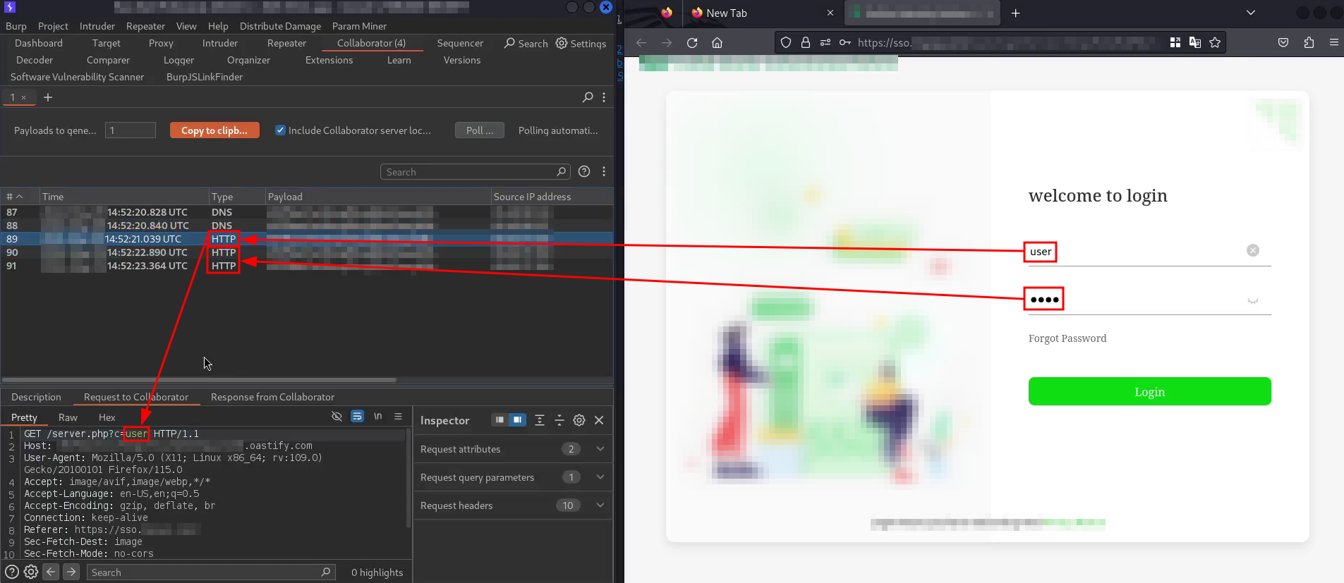 If the user clicks on the link associated with that GET request, the keylogger would be automatically imported from the malicious server. If he then enter his credentials into the login form, those credentials will be sent to the hardcoded Burp Collaborator server in the keylogger, even without clicking the Login button, as shown in the following capture: